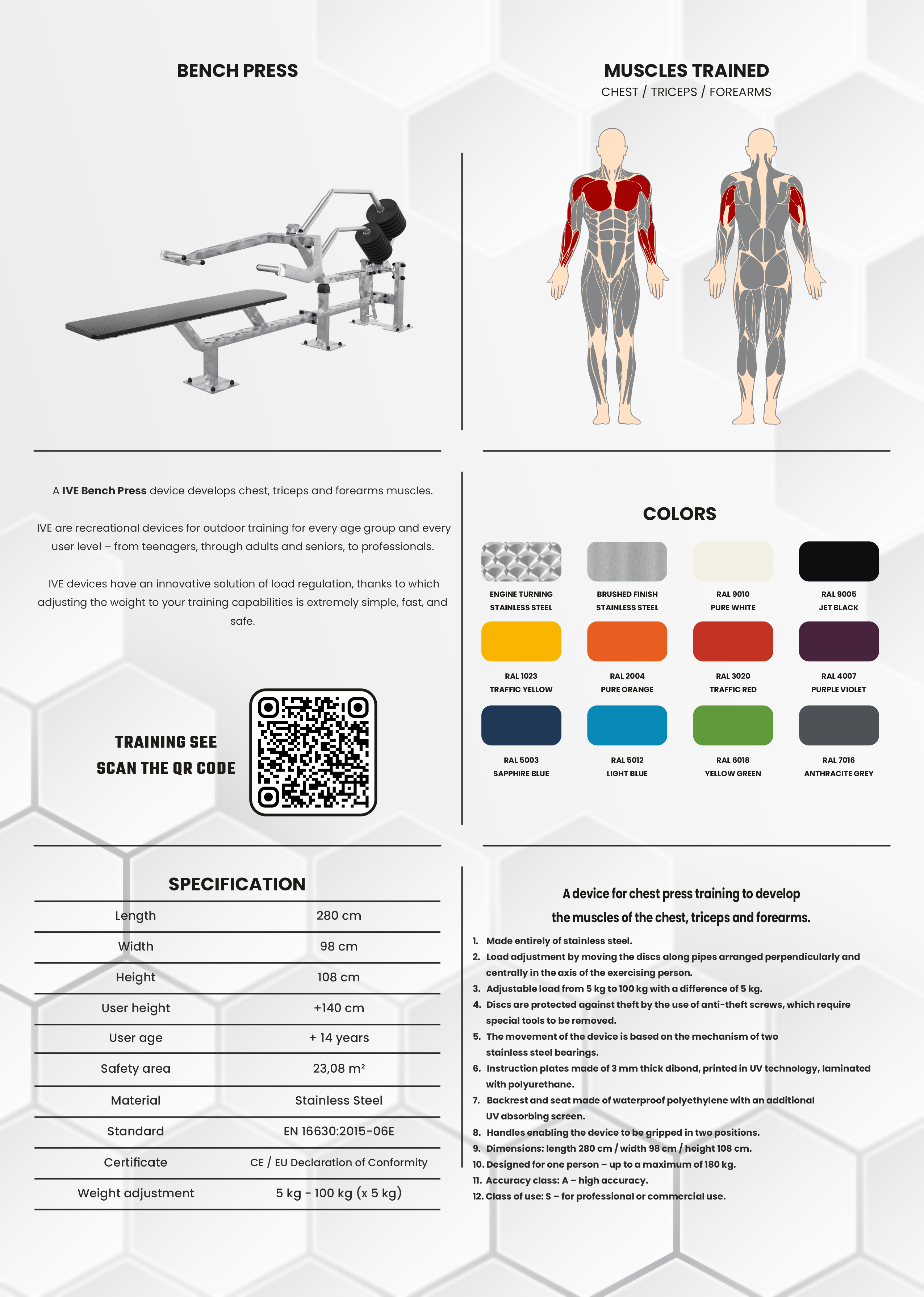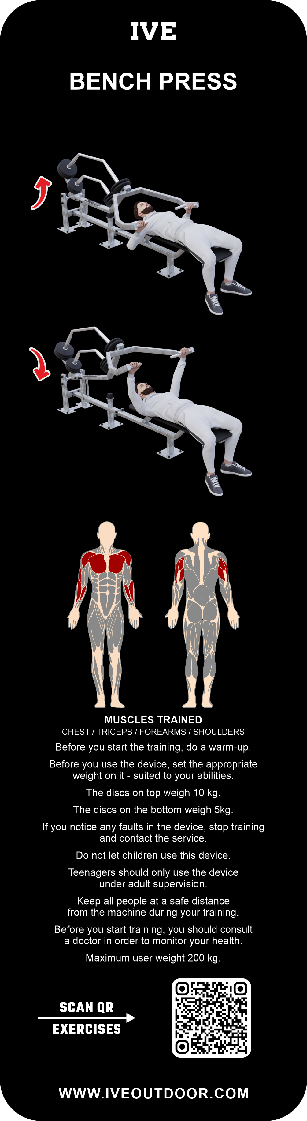 Das IVE Bench Press Gerät trainiert die Brustmuskulatur sowie Trizeps und Unterarme.