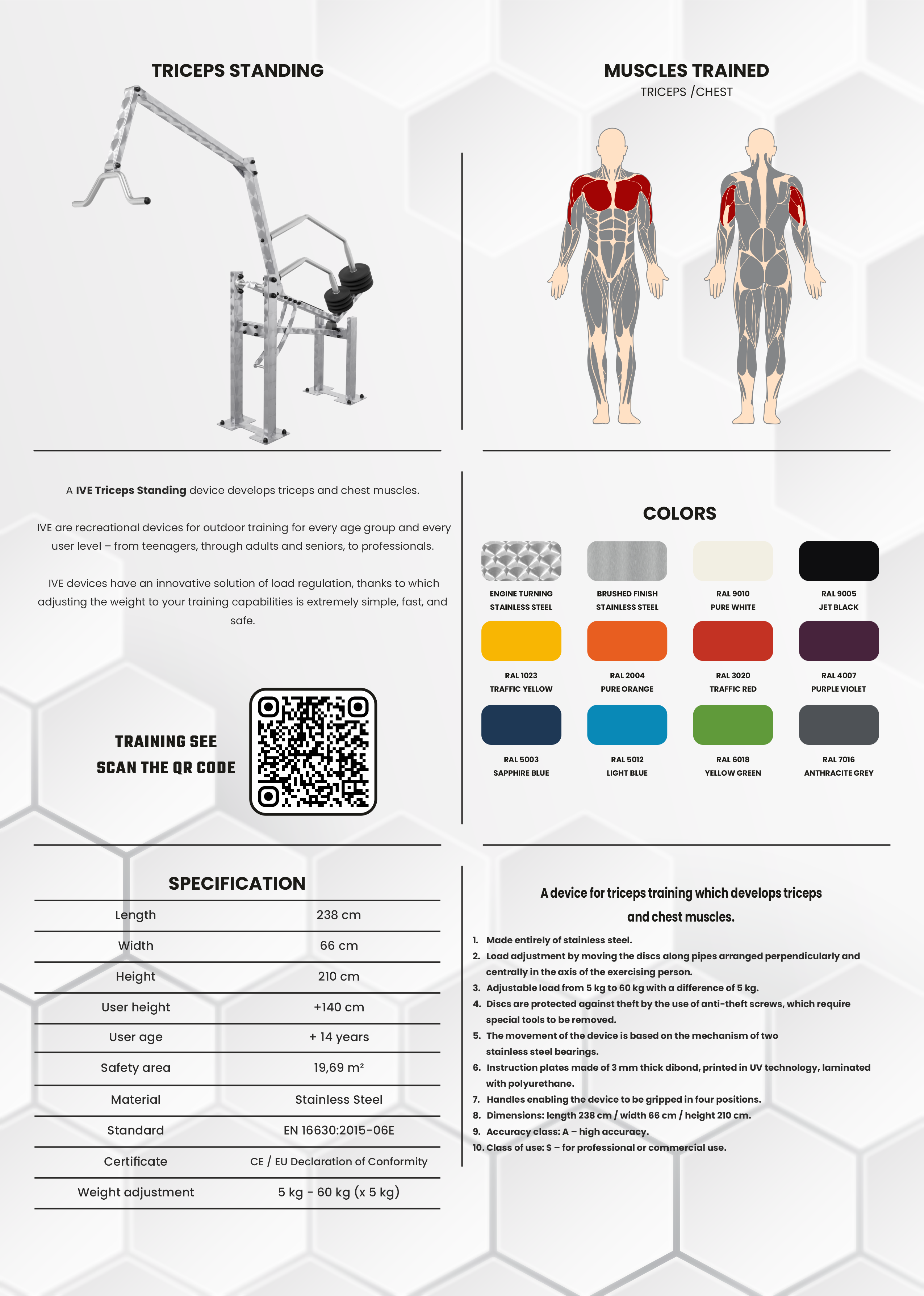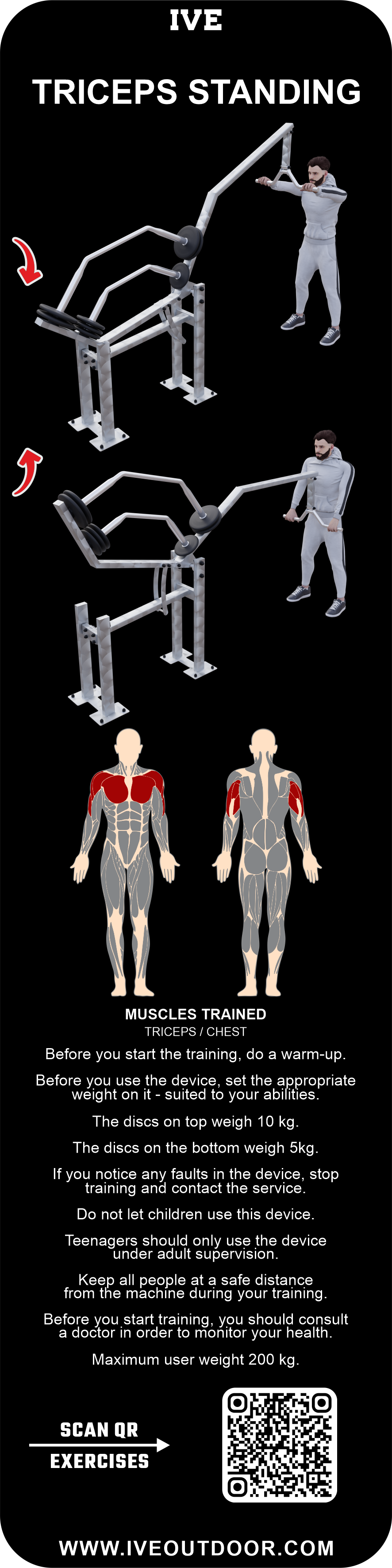 Das IVE Triceps Standing Gerät trainiert die Trizepsmuskulatur sowie die Brustmuskulatur.