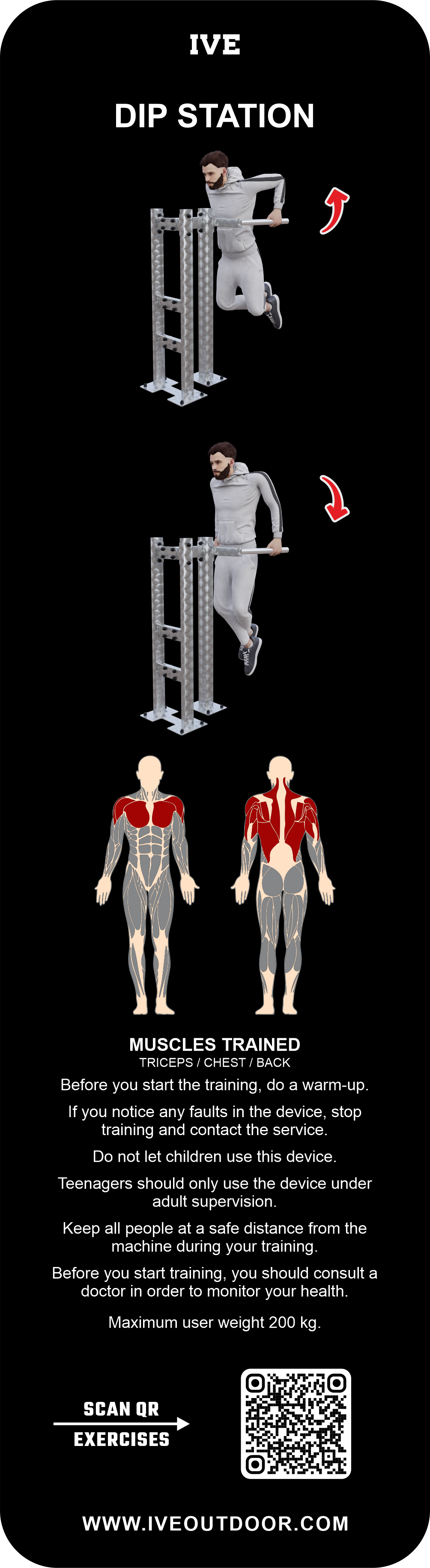 Die IVE Dip Station trainiert die Rücken- und Brustmuskulatur sowie Trizeps und Unterarme.