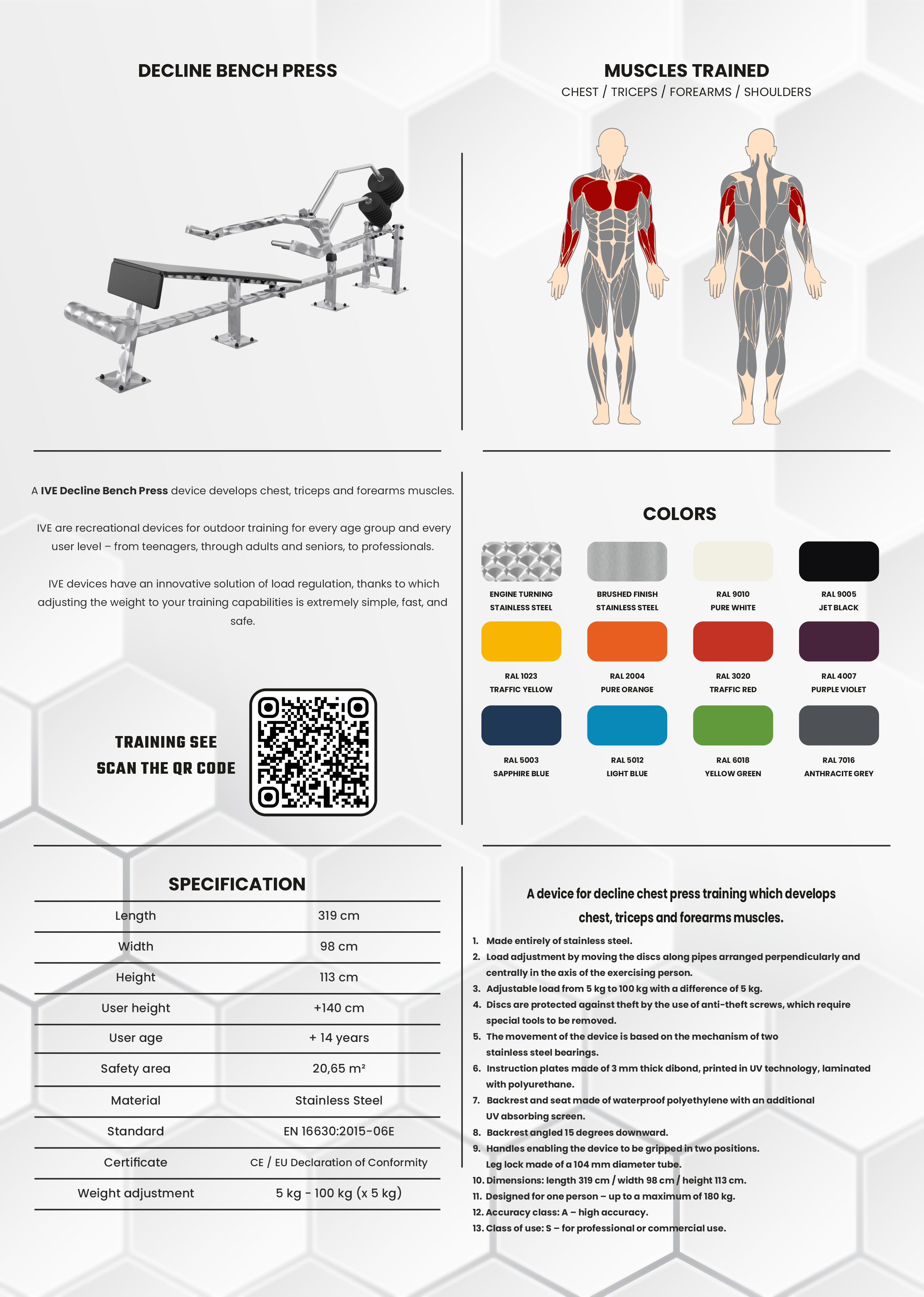 A IVE Decline Bench Press device develops chest, triceps, and forearms muscles.