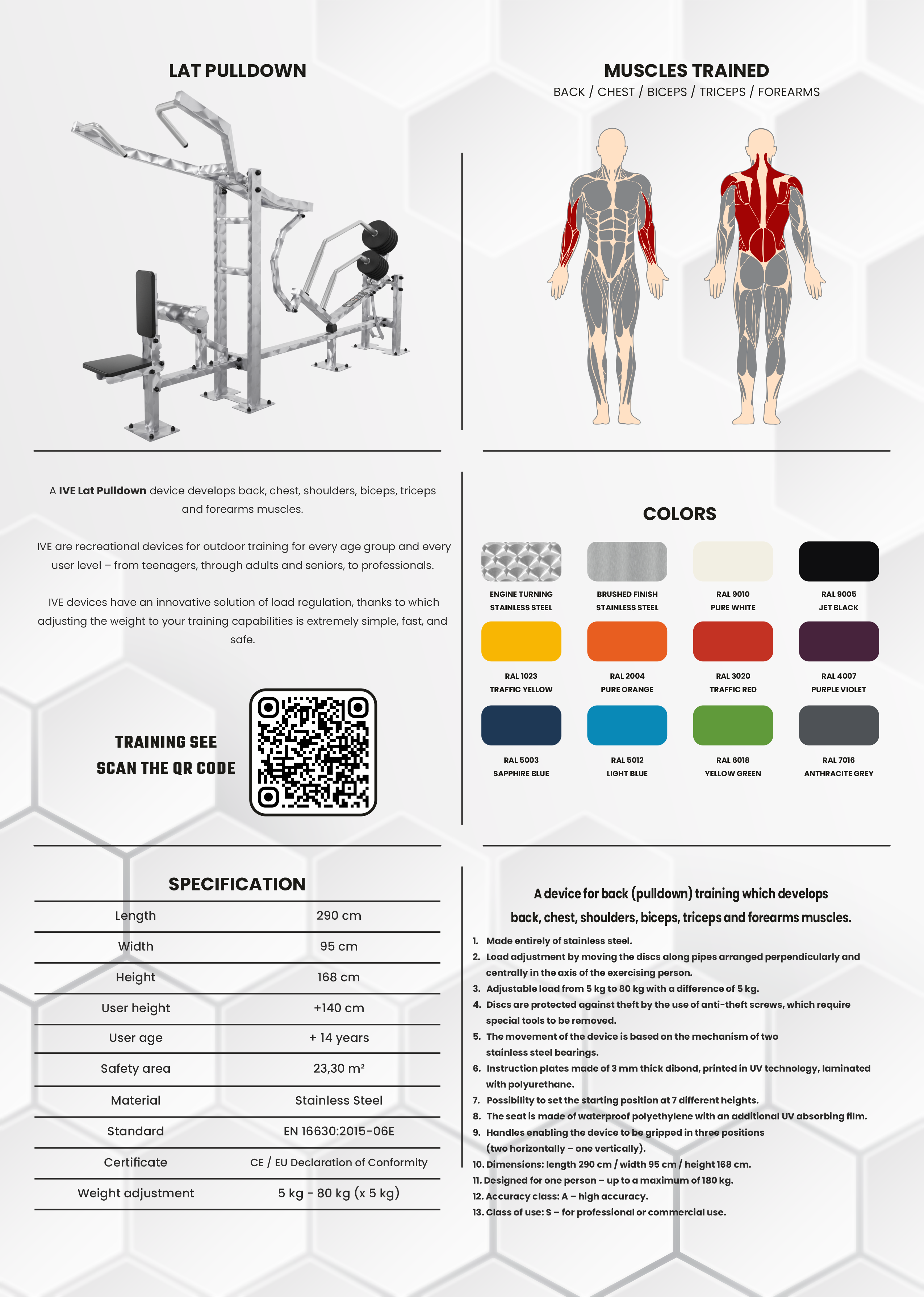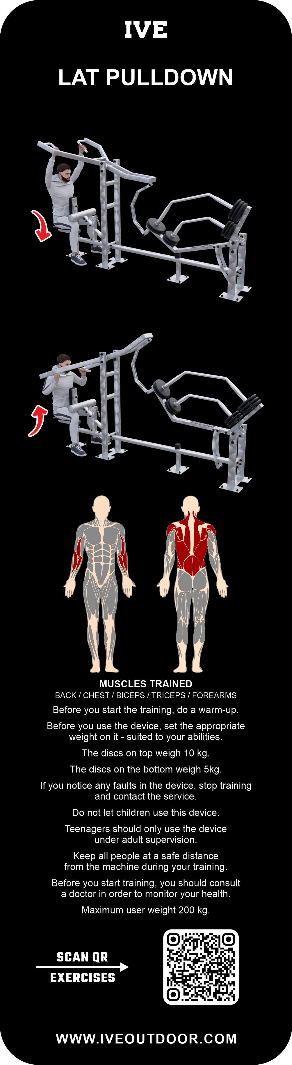 A IVE Lat Pulldown device develops back, chest, shoulders, biceps, triceps, and forearms muscles.