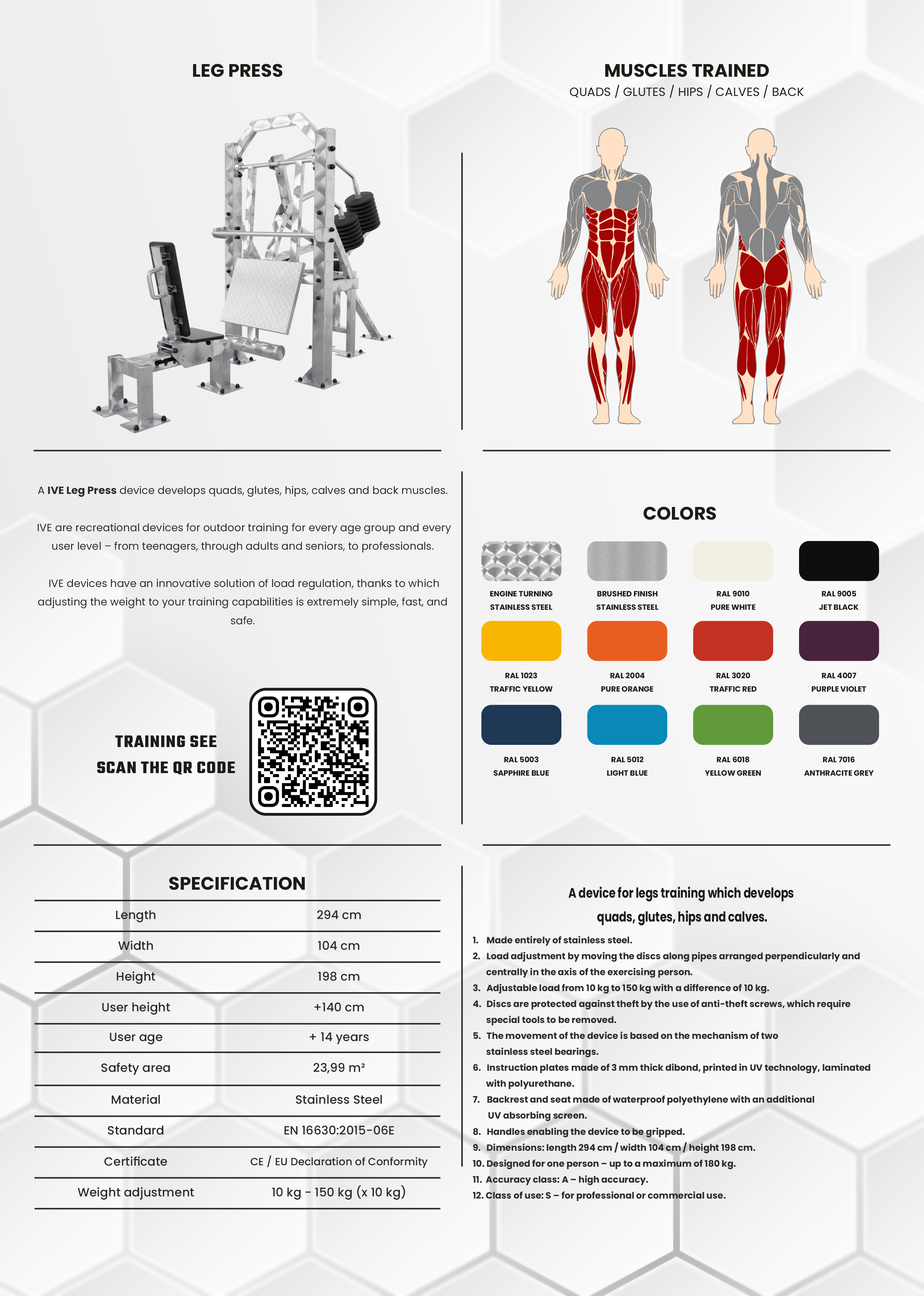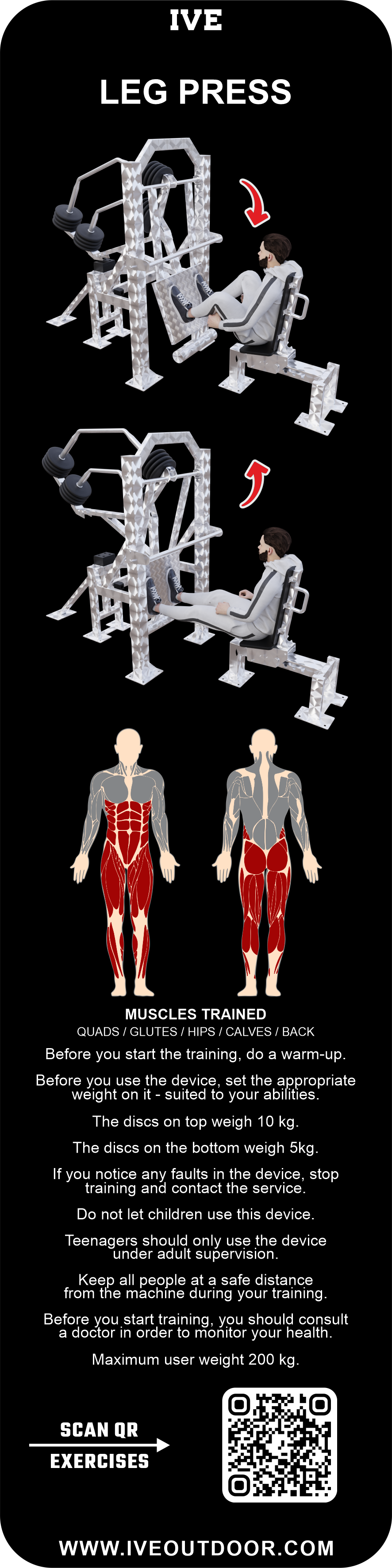 A IVE Leg Press device develops quads, glutes, hips, calves, and back muscles.