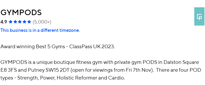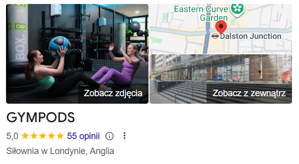 Kluby GymPods jako jedyne na świecie w branży fitness mają ocenę w Google 5,0 na 5,0 oraz niewiarygodna ocenę wśród klientów „benefitowych” 4,9 na 5,0 wśród ponad 5000 odwiedzających te kluby – to europejski rekord w skali wszystkich obiektów zrzeszonych w ClassPass – najbliższego odpowiednika MultiSport w UK.