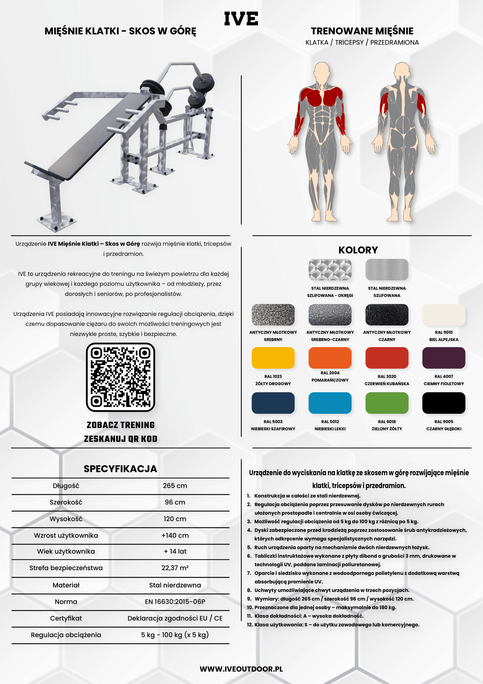 Urządzenie IVE Mięśnie Klatki – Skos w Górę rozwija mięśnie klatki, tricepsów i przedramion.