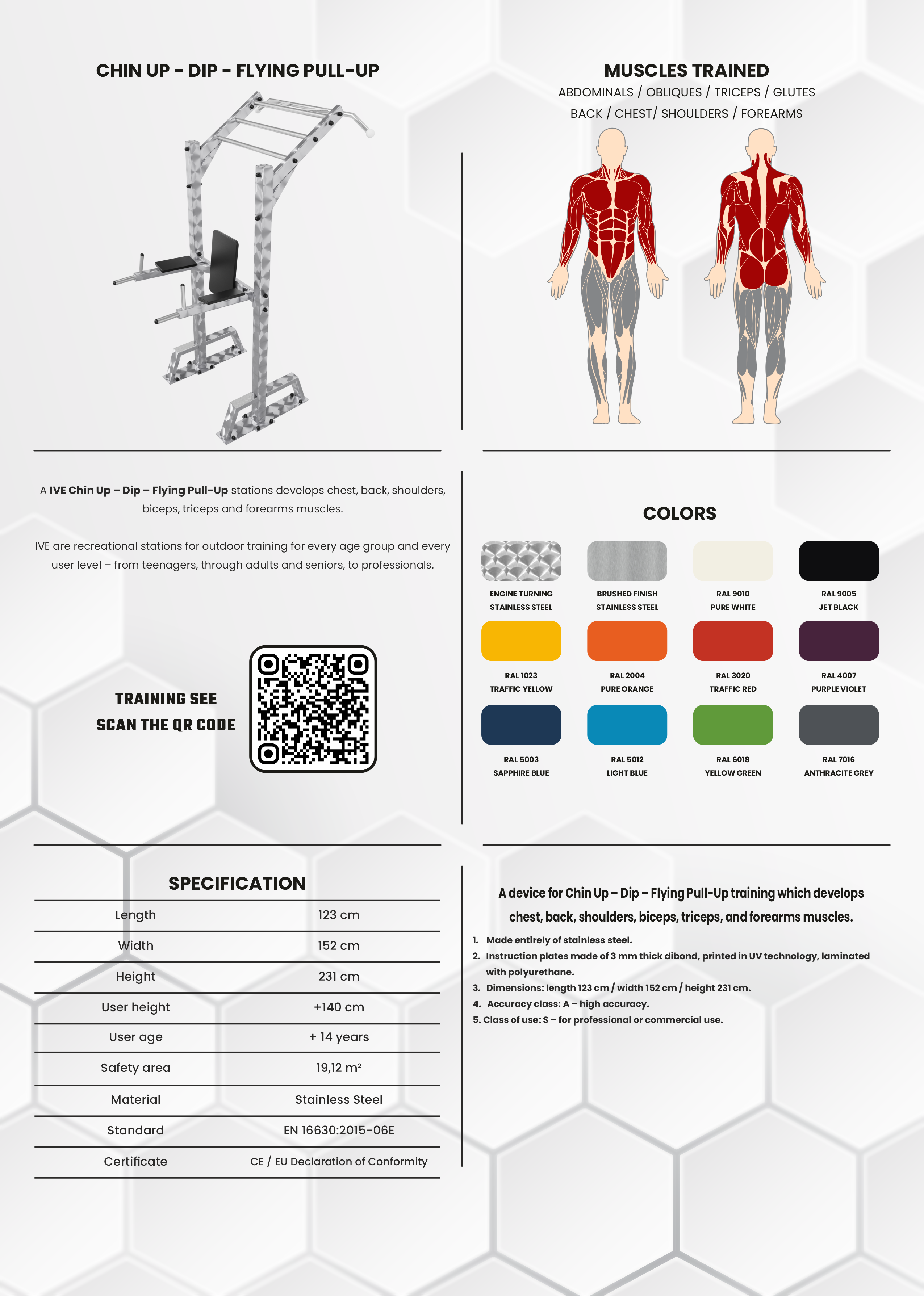 A IVE Chin Up – Dip – Flying Pull-Up stations develops chest, back, shouldersbicepstriceps, and forearms muscles.